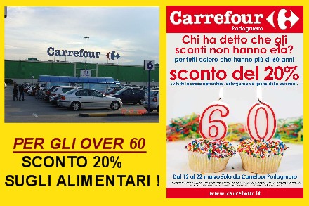 In questo momento di crisi l’iniziativa dell’ Ipermercato Carrefour di Portogruaro è senza dubbio una di quelle occasione da approfittare per tutti coloro che hanno passato i 60 anni di età, lo sconto 20% su tutta la spesa dell’alimentare e dell’igene personale, valida dal 12 al 22 Marzo, Domeniche comprese, è sicuramente un aiuto per fare quadrare il bilancio famigliare… messo sempre più a dura prova!