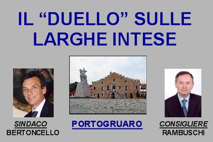 Intanto vi invito a guardare i video dell’Incontro in Villa Comunale, di Sabato 11 Luglio, dove il Sindaco Antonio Bertoncello, nel spiegare la sua visione sulle “Larghe Intese”, ha “duellato” a lungo con il Consigliere Anziano Pietro Rambuschi, molto “partecipe” il pubblico in sala, composto dai rappresentanti delle Associazioni Portogruaresi… G.B.