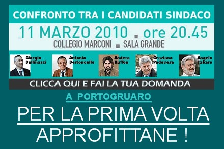 Questa volta vi parlo di un evento da me ideato e organizzato, si tratta di un doppio confronto tra i 5 candidati Sindaco per Portogruaro, ma non ho fatto tutto da solo, ecco i partner: Comitato per la Sicurezza Generale del Cittadino, Comitato Salute & Ambiente, Equo.Biz, Portogruaro.Net, che ringrazio tutti per il loro prezioso contributo.