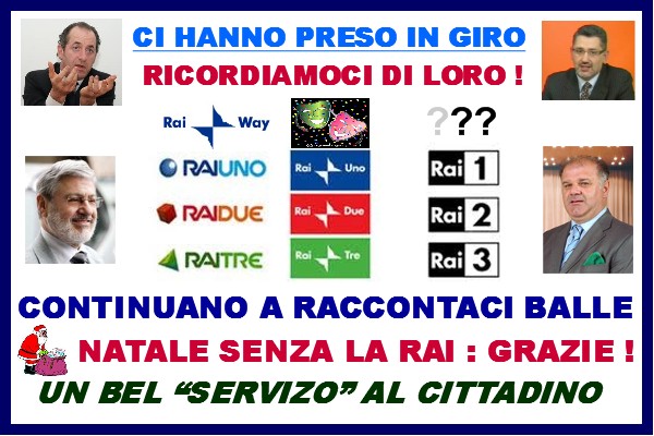 Devo stare attento a non lasciarmi andare, debbo sforzarmi a non usare tutte le parolacce che conosco contro questi “signori” che ci hanno lasciato per le Feste di Natale senza la RAI e senza dirci niente, forse non lo sanno che sono al servizio del Cittadino, questo è il loro compito e dovere, quando lo sanno fare, non è che ci fanno un favore quando andiamo a parlare con loro, sono lì apposta, qualcuno dovrebbe dirglielo o ricordarglielo…