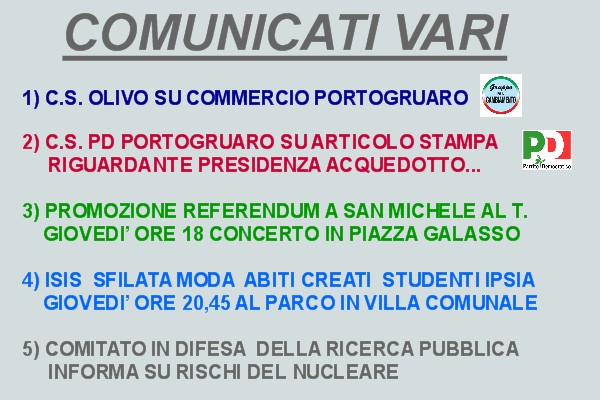 Due parole sui Comunicati, abbiamo quello di Francecso Olivo, del Gruppo per il Cambiamento, che spara a zero sul Commercio a Portogruaro, indicando il Comune come colpevole principale, tesi che non condivido per niente, anzi, per me sono i Commercianti che non hanno saputo adeguarsi alla trasformazione della Società e del Mercato, ma questo è un punto che va trattato in maniera specifica cosa che farò prossimamente…