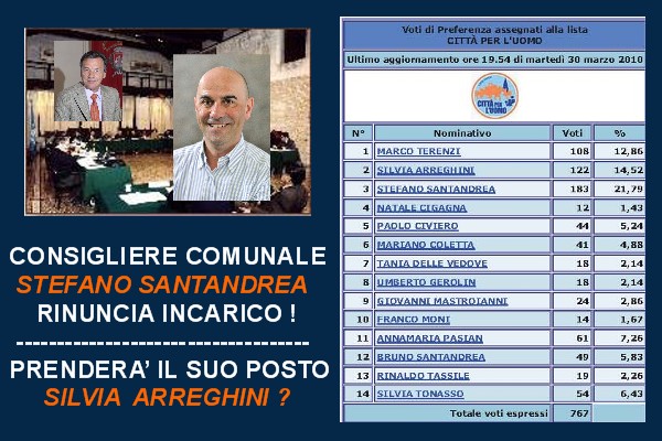 Una notizia che per me giunge nuova, una vera sorpresa, nei prossimi giorni ci sarà la Surruga al consigliere Stefano Santandrea, che nella sua Lista Civica “Città per l’Uomo” è seguito da Silvia Arreghini con 122 voti, sarà lei la sostituta?