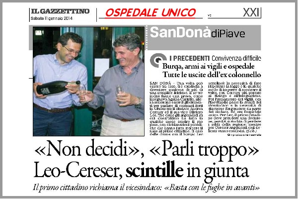 L’argomento che ha evidenziato un certo imbarazzo nei rapporti tra i due personaggi di spicco del governo della città (anche se Leo ha precisato che «con il sindaco va tutto bene, è troppo buono, non gli torcerei un capello»), è l’ospedale unico. Il vicesindaco esige una presa di posizione forte e chiede a Cereser di imporsi. «Stiamo rischiando di perdere i finanziamenti regionali – ha aggiunto ieri – e noi amministratori siamo stati eletti dai cittadini per prendere delle decisioni». «Comprendo i timori – la replica -, ma su un argomento così delicato non valgono imposizioni, ma concertazione e dialogo. Queste fughe in avanti non fanno bene a nessuno». Il segnale è stato dato.