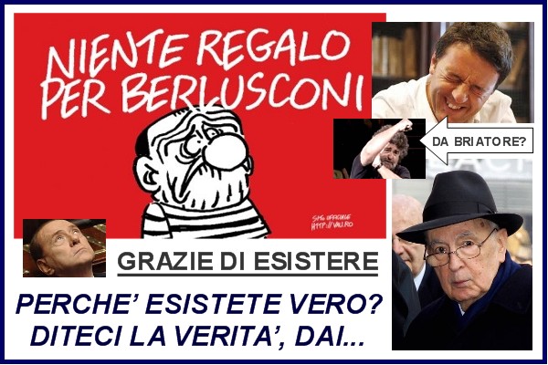 Di Silvio Berlusconi, il SUPER – LAZZARONE, nel senso che continua a resuscitare benchè dato più volte per morto, è inutile che vi parli, per lui parlano i suoi avvocati, anzi no, una cosa voglio dirla, giusto per farvi capire che è sempre la stessa politica, Renzi ha fatto una grande battuta sul post-norma contestata, una delle sue, ha detto: Berlusconi candidabile? “Sarà possibile solo se vince a Strasburgo, ma secondo me non lo fanno nemmeno entrare alla Corte dei diritti umani”! Però lui politicamente ci tratta!!