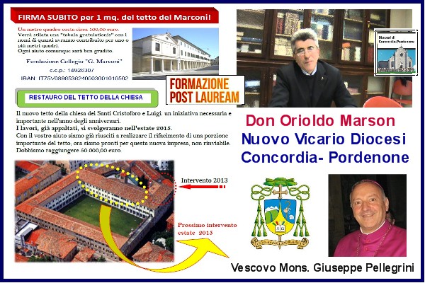 Ecco una importante notizia che riguarda il mondo religioso e non solo… Don Orioldo Marson è stato nominato Vicario dal Vescovo mons. Giuseppe Pellegrini della Diocesi di Concordia – Pordenone, una carica che da ulteriore prestigio al “Marconi”, dove continuerà a fare il Rettore…