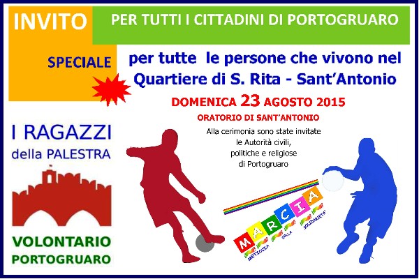 Iniziativa promossa dal Comitato di Coordinamento volontari “I Ragazzi della Palestra” di Portogruaro costituito il 21 luglio 2015 tra: Associazione Migranti della Venezia Orientale onlus, Gruppo Portogruaro Solidale, ACAT, ANDOS, Caritas Diocesana, Centri culturali islamici Assalam, El Nour e Orizzonti, Centro per i Diritti del Malato, Cgil Venezia, Cisl Venezia, Comitato per la Pace, Croce Rossa Italiana, Coop sociale Ape, Coop sociale L’Arco, Don Marcello Labor, Limen Universalis, In Famiglia, Porto dei benandanti, Università della Terza Età.
