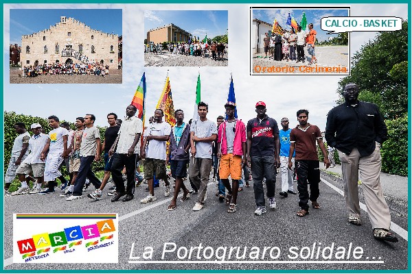 Il Corteo si è snodato per le vie delCentro Storico con una fermata in Piazza / Municipio, il tempo per una foto collettiva nella quale i profughi hanno composto con le lettere stampate un grande “Grazie Portogruaro, i Ragazzi della Palestra”.