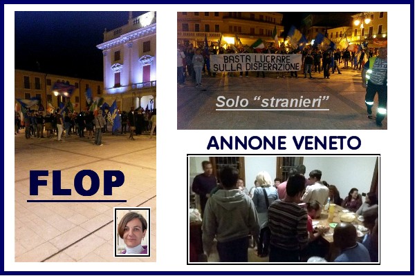 Nel titolo ho scritto un GRANDE FLOP, e qui lo ribadisco, ci saranno state circa un centinaio di persone, ma erano meno della metà se non si fossero aggiunti gli “stranieri”, tutta gente venuta da fuori, amici provenienti da altri Comuni, dunque non si manifestava per Annone Veneto, ma contro gli INVASORI DELL’ITALIA
