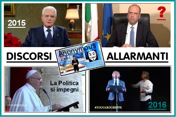 L’insolita fotografia che ne viene fuori è assai deludente, ascoltando il presidente Mattarella, il ministro Alfano, l’ologramma Grillo, Papa Francesco e l’hacker Anonymous, ne viene fuori un mix che ubriaca anche la mente più resistente e incallita, l’Italia sembra un puzzle difficile da mettere insieme, capirci qualcosa è quasi impossibile, ma un tentativo va fatto, almeno a inizio anno, che si spera sempre migliore del precedente, e con questi buoni propositi vi ho preparato sotto i video dei nostri eroi, ascoltateli e poi capirete che anche il 2016 sarà come sempre.. quel che Dio vorrà !