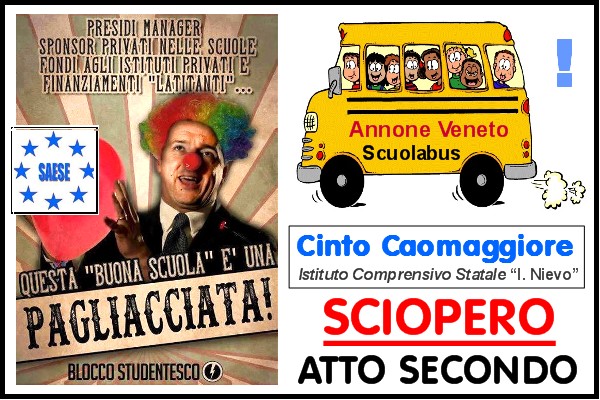Oggi, mercoledì 30 marzo 2016, nel Comparto Scuola è stato indetto uno Sciopero Generale dal SAESE, Sindacato Autonomo Europeo Scuola ed Ecologia, ma questa volta ad Annone Veneto hanno fatto le cose diversamente, niente Servizio bus di raccolta alunni per portarli a Scuola, viene garantito solo il ritorno, e a portarli nella struttura scolastica ci dovranno pensare i Genitori, sincerandosi che sia tutto a posto, essendoci uno Sciopero legalmente autorizzato in corso…