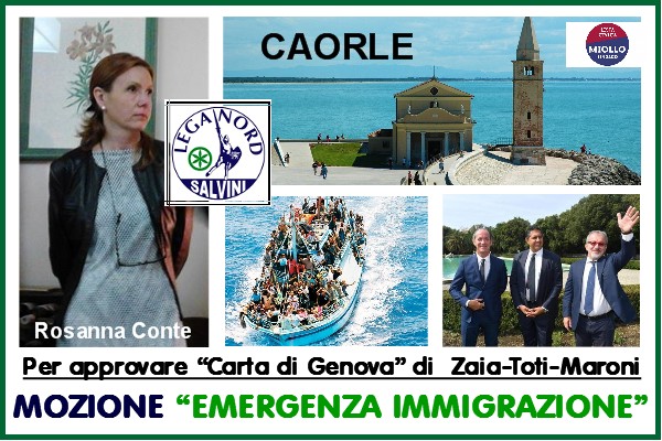 Queste le richieste contenute nella Mozione che la consigliera comunale della Lega Nord di Caorle Rosanna Conte ha depositato al fine di sostenere la “Carta di Genova” sottoscritta di recente dai presidenti del Veneto Luca Zaia, della Liguria Giovanni Toti e della Lombardia Roberto Maroni nella quale si dichiara “lo stato di emergenza del fenomeno immigrazione e non riconosce le quote e le modalità di assegnazione dei migranti da parte del Governo”.