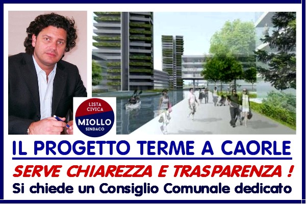 Richiesta di chiarimenti e di trasparenza sulle decisioni, con il coinvolgimento al riguardo di tutto il consiglio comunale: questa la sostanza dell’interrogazione con risposta urgente che i tre consiglieri del gruppo “Lista Civica Miollo Sindaco”, ovvero Carlo Miollo, Rosanna Conte e Tamara De Lazzari, hanno depositato quest’oggi in merito alla questione delle terme che già era stata oggetto di ampie discussioni nella recente campagna elettorale di Caorle.