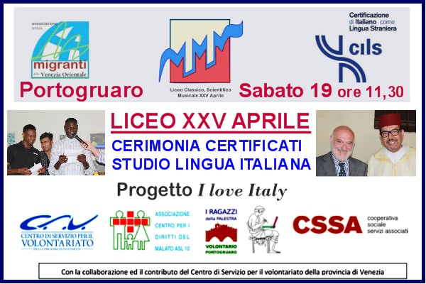 Alla Cerimonia di sabato parteciperanno i rappresentanti dei Comuni di Portogruaro e Concordia Sagittaria, i docenti ed i volontari del Progetto I love Italy, i Dirigenti della coop CSSA e alcuni allievi e docenti del Liceo XXV Aprile assieme al Dirigente prof. Roberto Barbuio.