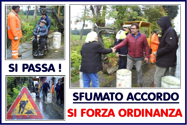 A Scapin è scappato di firmare, passatemi il gioco di parole, solo ora questa Ordinanza, un tristemente ridicolo “tira e molla”, che comunque sancisce che prima si sono “introdotti” senza i dovuti permessi in casa altrui, piazzando per due volte un Cantiere con la gente che pericolosamente passava loro accanto, solo adesso, in questa Ordinanza si specifica che la strada verrà chiusa durante i lavori, e allora come la mettiamo ? Quella Ditta esterna poteva trovarsi là e fare quello ha fatto? E poteva il Dirigente del Comune Scapin dare per ben due volte il via di inizio lavori agli Operai presenti, anche se non andati a buon fine ?