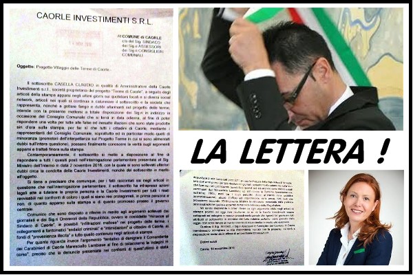 Il sottoscritto CASELLA CLAUDIO in qualità di amministratore della Caorle Investimenti s.r.l., società proprietaria del progetto “Terme di Caorle”, a seguito degli articoli della stampa apparsi negli ultimi giorni sui quotidiani locali e su diversi Social network, articoli nei quali si continua a calunniare il sottoscritto e la società che rappresenta, nonché a gettare fango e dubbi allarmanti sul progetto delle terme, intende con la presente mettersi a totale disposizione dei Sig.ri in indirizzo in occasione del Consiglio Comunale che si terrà in data odierna, al fine di poter rispondere una volta per tutte alle false e inesatte illazioni che sono state prodotte sin d’ora sulla stampa, per far sì che tutti i cittadini di Caorle, mediante i rappresentanti del Consiglio Comunale, soprattutto e in particolar modo quelli di minoranza (promotori dell’interpellanza sul Progetto Terme in cui si sono alimentati dubbi sull’intera questione), possano finalmente conoscere la verità sugli argomenti apparsi e trattati finora sulla stampa.