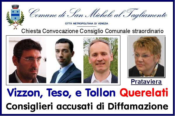 Si informa che in data 16/12/20 16 presso la Stazione Carabinieri di Portogruaro (VE ) è stata sporta querela da parte della sig.ra Vania Prataviera (Presidente della Bibione Spiaggia S.r.l. – società partecipata-controllata da questo Ente) contro i Consiglieri Giorgio Vizzon, Luca Tollon e Emiliano Teso per i reati previsti e puniti dagli artt. 595 (diffamazione) e 612 (atti persecutori osi. “stalking) del Codice penale.