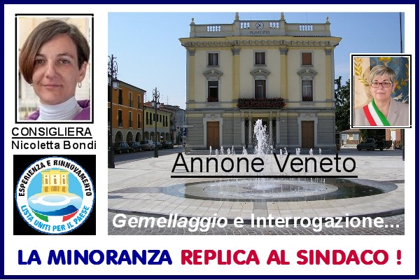 NOTA Arrivata la “replica” della Minoranza di Annone Veneto, con il testo integrale dell’intervento della consigliera Nicoletta Bondi (clicca qui), al riguardo del Regolamento sul Gemellaggio (clicca qui), così ognuno potrà dedurre se le rimostranze del Sindaco avevano fondamento.