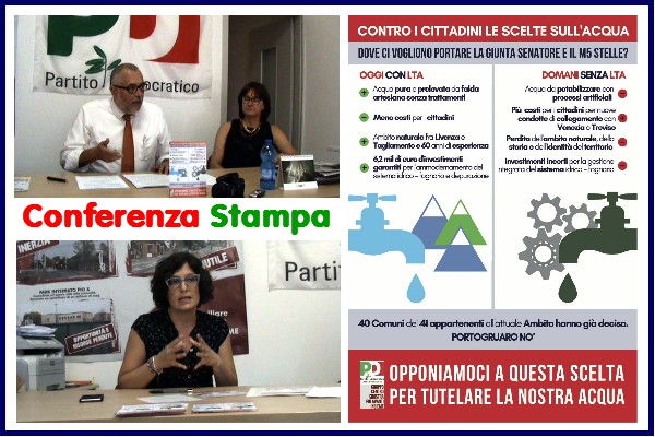 Portogruaro, sabato 9 settembre 2017, Conferenza stampa del Circolo PD locale, a chiarimento delle diversi posizioni politiche con la Maggioranza che governa la città, sulla delicata questione dell’Acqua, bene primario da tutelare e conservare, e che in questo momento viene messa “in pericolo” dalla Giunta Senatore, “aiutata” dal Movimento 5 Stelle… così almeno la pensa il PD e il Gruppo consiliare “Centro Sinistra – Più Avanti insieme”, e a questo proposito hanno pensato bene a distribuire un Volantino che illustra i rischi che si corrono, in modo da informare tutti i cittadini…