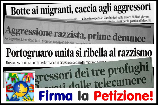 Domenica 8 ottobre in viale Trieste nella città di Portogruaro (Ve), un gruppo formato da una decina di persone provenienti da Treviso ha aggredito tre giovani africani mentre uscivano da un supermercato. Le iniziali offese verbali “negri del c…” e “negri figli di p…..” sono poco dopo sfociate in un brutale pestaggio con pugni, schiaffi e calci. Per i tre giovani ragazzi è stato necessario l’accesso in ospedale dove sono state riscontrate contusioni al volto, braccia e nuca con prognosi di 10,15 e 30 giorni.