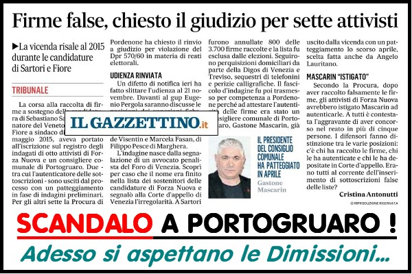 Su facebook (clicca qui) ho scritto che sono rimasto sgomento e indignato nell’apprendere dalla stampa locale (clicca qui) la notizia dell’avvenuto patteggiamento nell’Aprile scorso di Gastone Mascarin, presidente del Consiglio comunale di Portogruaro, al riguardo delle FIRME FALSE da lui autenticate ad esponenti veneziani di FORZA NUOVA relative alle elezioni del 2015, un fatto gravissimo e fino adesso taciuto sia in Consiglio comunale sia ai cittadini di Portogruaro, come invece avrebbe dovuto fare per correttezza e trasparenza istituzionale che il suo ruolo impone, e che per questione di etica politica, Mascarin farebbe bene a dare le sue Dimissioni, prima che siano gli altri a chiederlo…