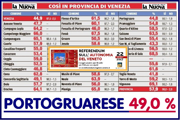 Andando al voto del Referendum nel Portogruarese, vediamo che a Portogruaro ha votato il 44,8%, mentre il Comune con la più alta affluenza è stato Caorle con il 57,9%, il più basso Teglio Veneto con il 41,8%, mentre come media degli 11 Comuni del mandamento portogruarese, registriamo un 49,0%, dati che tutto sommato non sono male, anche considerando che non hanno votato i cittadini veneti/ portogruaresi residenti all’estero *, che avrebbero alzato di qualche punto le percentuali…