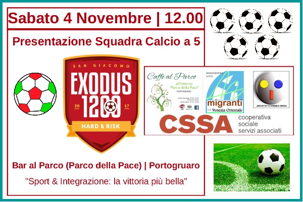 “Exodus- 1.200 San Giacomo”: è il nome della Squadra di Calcio a 5 che si è costituita tra i Richiedenti protezione internazionale ospitati a Portogruaro e che sarà presentata ufficialmente il prossimo sabato 4 novembre al Bar al Parco della ex Villa Marzotto di Portogruaro con un aperitivo alle ore 12.00.