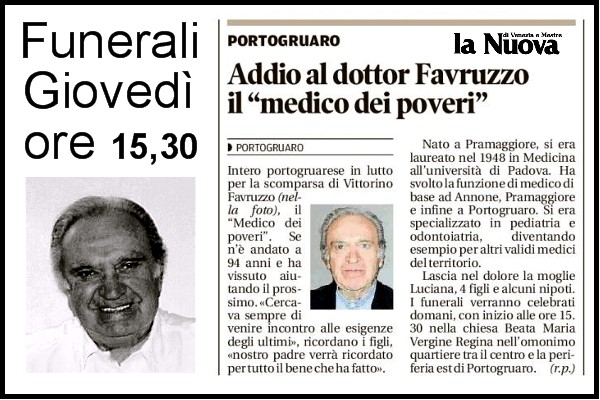 Portogruaro perde un altro personaggio illustre, il dottor Vittorino Favruzzo era persona molto nota in città, e la notizia della sua morte è stata riportata anche nella stampa locale (Clicca 1 e 2), aveva 93 anni, e da qualche tempo era ospite nella Residenza Santa Margherita di Villanova di Fossalta.