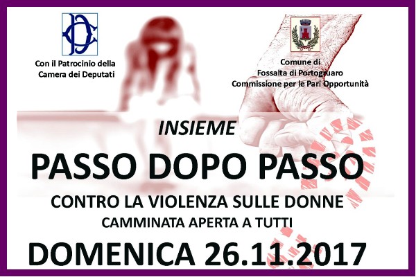 In occasione della Giornata mondiale contro la violenza sulle donne i Comuni del Veneto Orientale e i Comuni limitrofi del Friuli organizzano per il giorno domenica 26 novembre 2017 la camminata “Passo dopo passo” contro la violenza sulle donne.