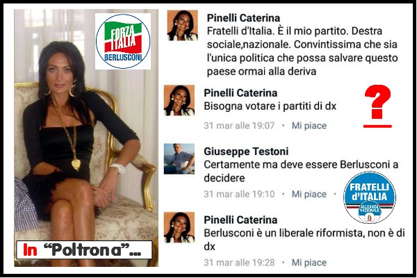 Allora ci si chiede come sarà accolta in loco la Pinelli, che ha criticato i Consiglieri comunali di Forza Italia, sia quelli di Maggioranza che di Minoranza, Assessore compreso (e attuale coordinatore FI), una che una settimana prima era “tutta di Destra” e la settimana dopo di Forza Italia, quel Partito che non era da votare perché non era la soluzione del Paese, cosa è cambiato in una settimana? Forse il posto di una poltrona bella comoda, quella poltrona che la Pinelli diceva di non cercare (vedi nei pdf), magari lei si è presentata come portatrice di un pacchetto importante di voti e le è stata prospettata una candidatura “sicura” per le imminenti politiche, poi cosa volete se del leader di Forza Italia  scrive : “Le ultime dichiarazioni di Berlusconi sull’Europa mi destabilizzano,deve far chiarezza sui temi più importanti: 1) Europa e difesa dei confini, 2) tutela delle nostre aziende dalla globalizzazione 3) clausola anti inciuci (no a un altro nazareno) 4)un tetto massimo di tassazione inserito in costituzione. Senza queste condizioni non può esserci coalizione. Il vero potere è nostro , rinforzate le dx, andate a votare” (clicca qui), oppure quando dice di avere la giornata rovinata nell’apprendere del  “Silvio pensaci tu” Merkel e Berlusconi , l’asse anti-populisti. (clicca qui)