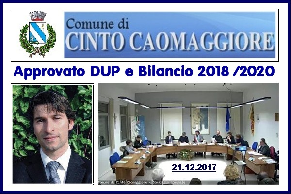 Approvato in Consiglio Comunale, lo scorso 21 dicembre 2017, il DUP (Documento Unico di Programmazione) e il Bilancio previsionale 2018-2020 del Comune di Cinto Caomaggiore. Era dal 2009 che questo iter non veniva completato entro il 31 dicembre, come richiederebbe la Legge. Addirittura dal 2005 che non veniva approvato con tale anticipo.