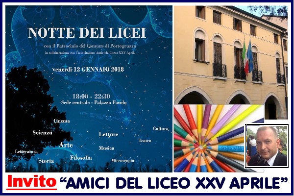 A partire dalle ore 18 di venerdì 12 gennaio 2018 e sino alle ore 23 il Liceo Classico Scientifico Musicale XXV Aprile di Portogruaro aprirà le porte alla Città proponendo conversazioni, conferenze, letture, laboratori, workshop, performance, “degustazioni” letterarie e artistiche, per promuovere il valore dei Classici e mostrarne l’attualità.