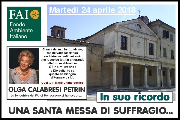 per ricordare OLGA CALABRESI PETRIN a un anno dalla sua scomparsa comunica che si terrà una Santa Messa in suffragio, martedì 24 aprile alle ore 19 nella Chiesa dei Ss. Cristoforo e Luigi del Collegio Marconi a Portogruaro. (clicca qui)