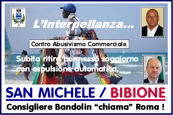 NOTA – Ecco una Interpellanza che mi sarei aspettato non dal consigliere indipendente Giampietro Bandolin, ultimamente molto attivo con numerose interpellanze e interrogazioni, ma dal capogruppo Luca Tollon che è anche Segretario provinciale della Lega, e se vi state chiedendo perchè, presto detto, si parla di ritiro del permesso di soggiorno con espulsione immediata per gli stranieri che praticano l’abusivismo commerciale, una piaga per le nostre spiagge… (*)