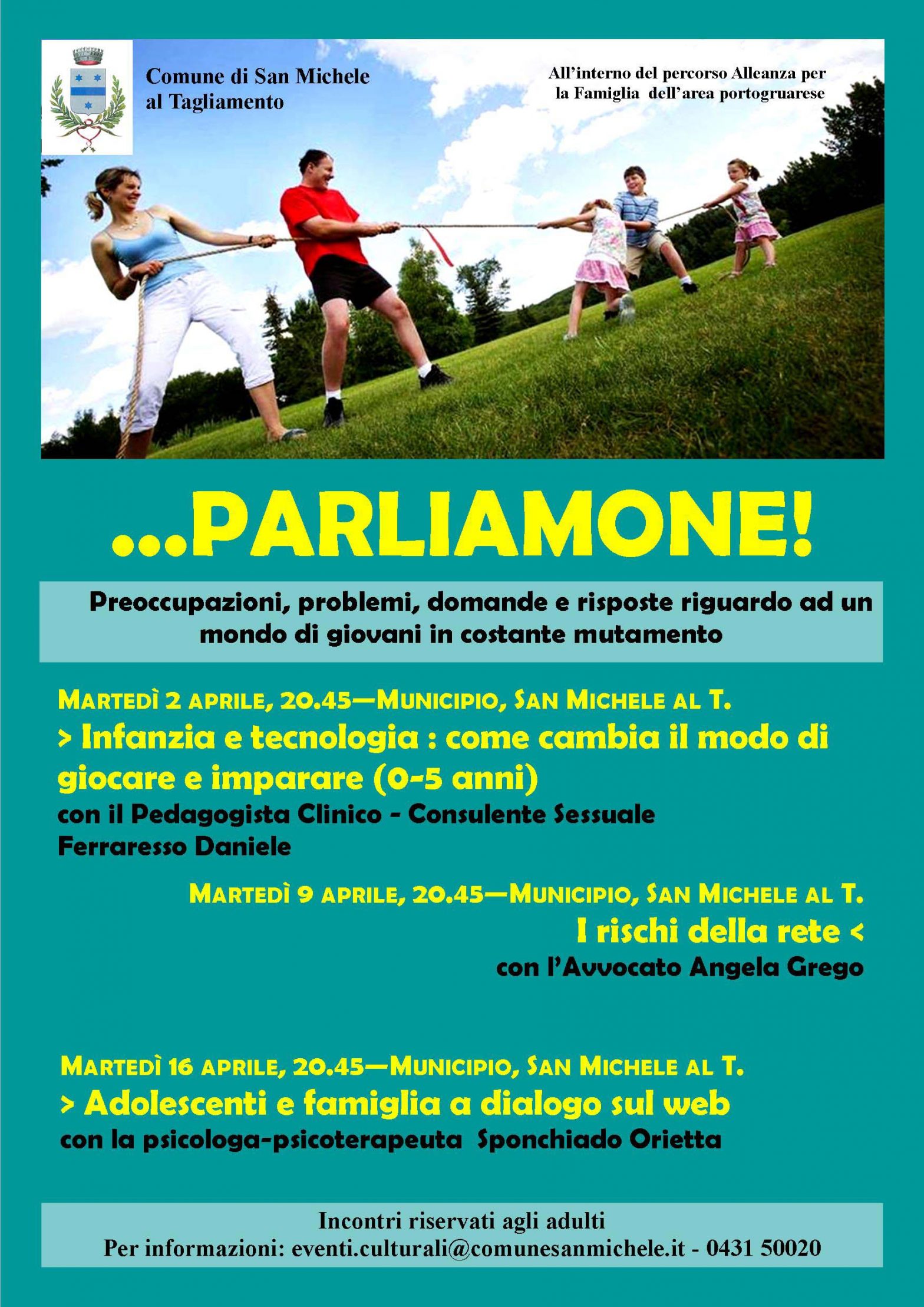 Dopo il successo della scorsa edizione del ciclo di incontri per i genitori dal titolo “…Parliamone!”, l’Amministrazione ha deciso di continuare con una seconda edizione, organizzando tre incontri primaverili.