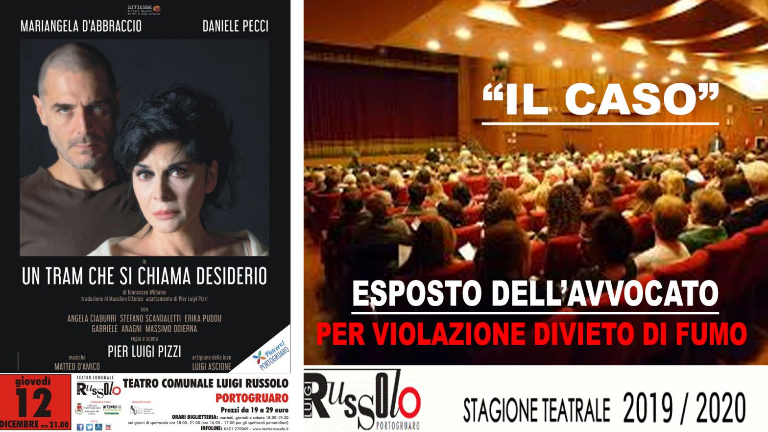 Non sono fumatrice e ritengo di avere il pieno diritto e la piena libertà di scegliere se subire o meno fumo passivo, che non solo è sgradevole ma è risaputamente cancerogeno. Come noto, l’art. 51 della Legge 16 gennaio 2003, n. 3 rubricato “Tutela della salute dei non fumatori” definisce le misure che servono a eliminare l’esposizione al fumo passivo nei luoghi di lavoro e locali pubblici chiusi. La Legge ha esteso il divieto di fumo a tutti i locali chiusi, pubblici e privati, stabilendo il principio che non fumare, nei locali chiusi, è la regola. Fumare, nei locali chiusi, è l’eccezione: oltre che nelle residenze private, si può fumare unicamente in locali riservati ai fumatori. Questi ultimi devono essere dotati di impianti per la ventilazione ed il ricambio di aria, regolarmente funzionanti, aventi le caratteristiche tecniche fissate con Decreto del Presidente del Consiglio dei Ministri del 23 dicembre 2003. Non mi risulta prevista una deroga al divieto di fumo nei teatri. E non è la prima volta che al Teatro Russolo gli attori fumano in scena. È successo, per esempio, durante la scorsa stagione di prosa, in occasione dello spettacolo “Dieci piccoli indiani, e poi non rimase nessuno”. Ma non soltanto.