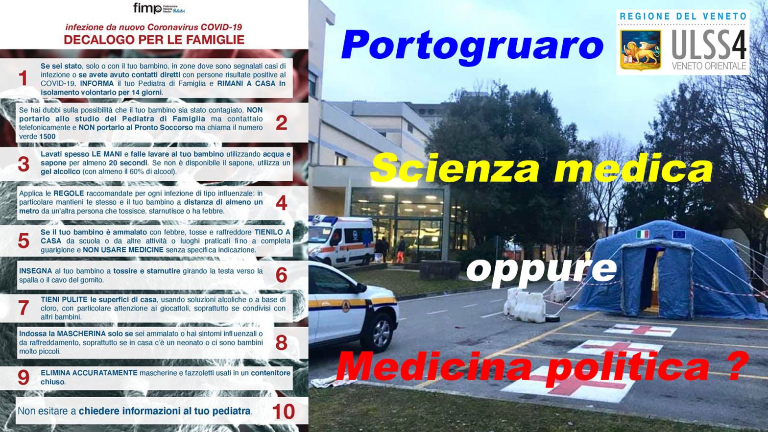 A Portogruaro hanno montato la Tenda fuori del Pronto Soccorso (clicca qui), l’Ulss4 Veneto Orientale ha fatto delle Riunioni con i Sindaci del Territorio (clicca qui), la sindaco Maria Teresa Senatore e il vicesindaco Luigi Toffolo (medico) ci hanno rappresentato, è stato diramato dalla Dirigenza medica l’Orario visite da rispettare per l’Ospedale cittadino (clicca qui), divulgato un Decalogo (clicca qui) della FDI (Federazione Medici Italiani) Pediatri per le Famiglie su come affrontare l’infezione da nuovo coronavirus COVID-19, bene tutto questo, la macchina organizzativa si è mostrata funzionante, i Mercati cittadini e gli Allenamenti delle attività sportive tutte, sono stati ripristinati dopo un iniziale STOP come da elenco sopra citato, i vari Campionati sportivi, come il calcio, ancora NO, gli Eventi sia pubblici che privati che richiamano molte persone NO, e mi fermo qui, ora piano piano, sbloccheranno tutto, ci diranno che andava tutelata la nostra salute, ma di salute io credo che a qualche “comandante” mancava quella “mentale”…