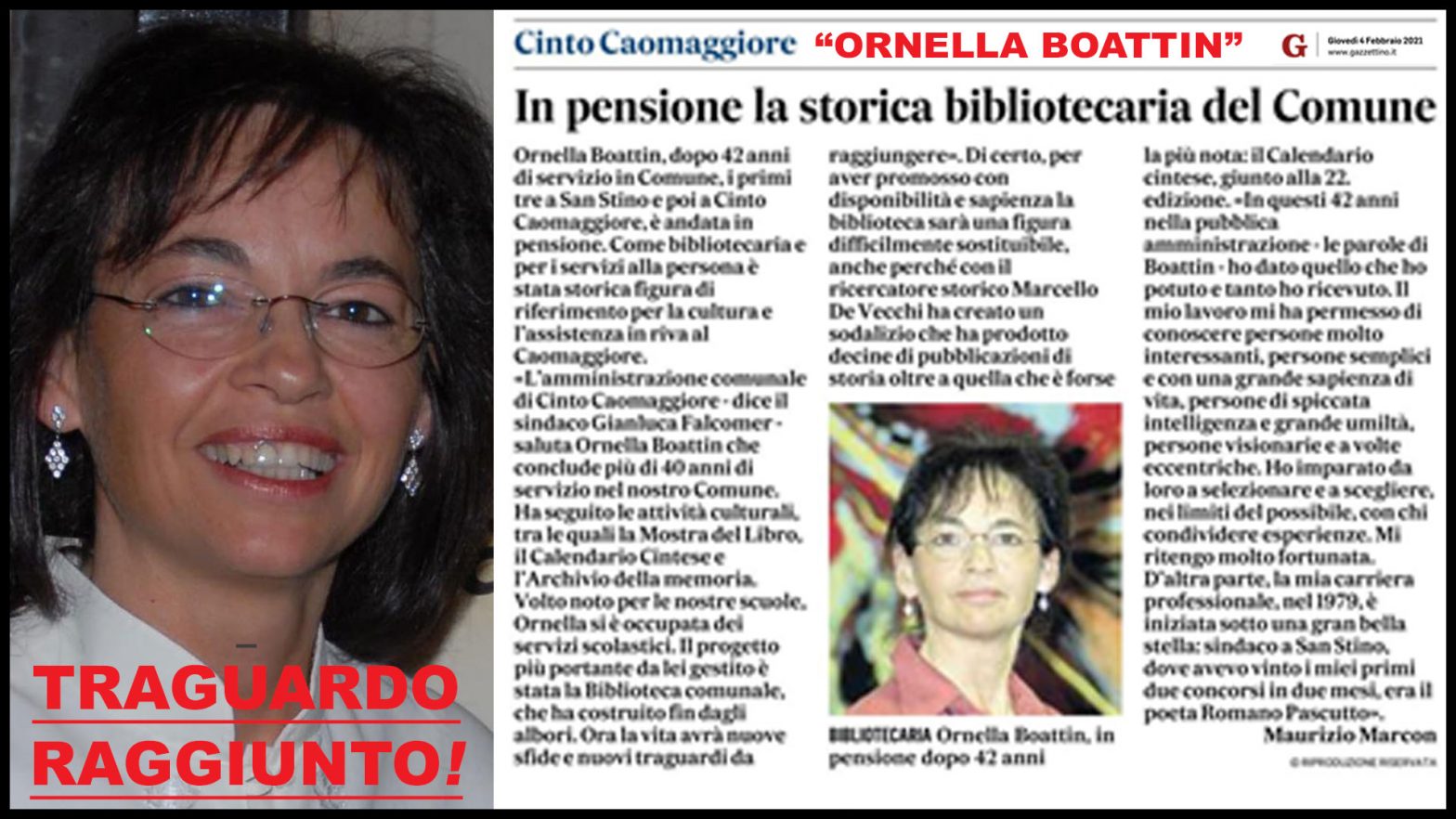 Riprendo la notizia di oggi sul Gazzettino a firma di Maurizio Marcon (*), dove si evidenzia il bel traguardo raggiunto da Ornella Boattin, che dopo ben 42 anni di onorato servizio in Comune, ora lascia e va in quiescenza, ossia in pensione, per tutti era la “bibliotecaria”, anche se a dir il vero è riduttivo definirla così, in quanto ha un Curriculum (clicca qui) di tutto rispetto: