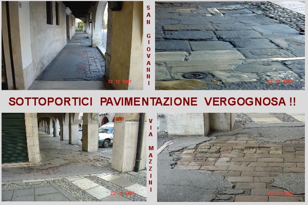 Davvero incredibile lo stato della pavimentazione dei Sottoportici di Borgo San Giovanni, sopratutto nel tratto finale, vicino alla torre. Ogni volta che ci passo mi chiedo come si può tollerare una situazione così, se non si sta attenti ci si inciampa e si cade, cosa questa non rara, come successo anche a mia sorella.