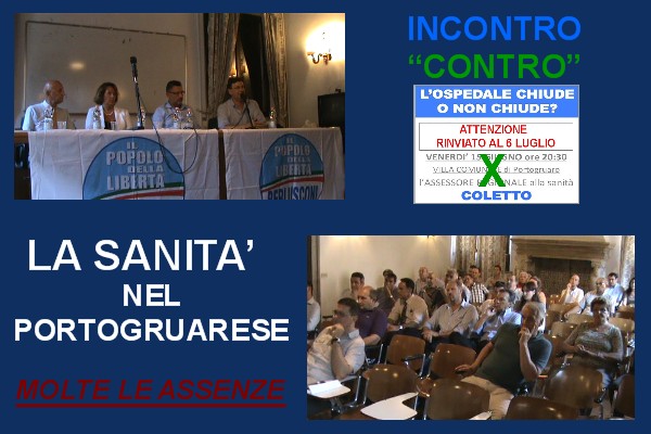Forse è per questo che non c’erano molti cittadini,ma soltanto “addetti ai lavori”: alcuni medici, il vicesindaco di Meolo, l’ex sindaco di Eraclea,gli “ibridi” consiglieri portogruaresiLuigi Geronazzo, Gastone Mascarin e Luciano Gradini, sei sindaci del portogruarese, Luciano Striuli di Caorle, Giacomo Gasparotto di Gruaro, Leopoldo Demo di Pramaggiore, Pasqualino Codognotto di San Michele al Tagliamento, Antonio Bertoncello di Portogruaro e per ultimo nomino Renato Querini di Cinto Caomaggiore, cheil Coordinatore del Pdl Igor Visentin si era (chissà come mai) dimenticato di menzionare tra i presenti, per poi correggersi successivamente…