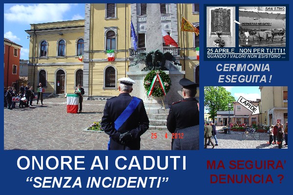 Nessun “incidente” ha turbato il 67° Anniversario della Liberazione, c’era molta attesa qui a San Stino di Livenza dopo il diniego alla richiesta formale del Sindaco Luigino Moro, versola Proprietà di un Esercizio pubblico (Bar), di porre dei fiori ai piedi della Lapide lì situata, che ricorda il sacrificio dei Legionari Cecoslovacchi…