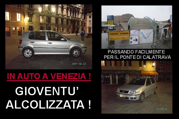 Dei ragazzi e ragazze, poco più che ventenni, ancora in giro alle 4,30 del mattino, ubriachi e incoscienti di quello che le loro stupide azioni possono provocare, passare con la macchina a velocità sostenuta sopra il ponte di Calatrava, per poi andare a fermarsi a campo San Geremia, sugnifica avere percorso un lunghissimo tratto che va dalle Fondamenta  Santa Lucia, passando davanti al Piazzale della Stazione  e percorrendo tutto Rio Terà, solo Dio sa come nessuno ci sia finito sotto a quell’auto nella sua folle corsa…