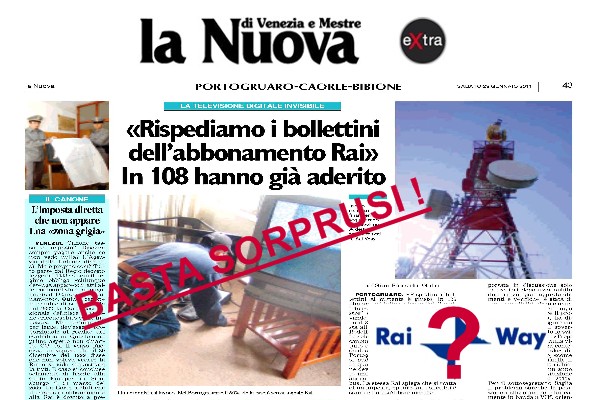 Ci prendono tutti per i fondelli: la RAI, l’eccezionale (ma catastrofica) Raiway con tutti i suoi ultraspecializzati componenti ed esperti, il ministro Romani, il sottosegretario Saglia (poveraccio! che figura gli han fatto fare!), la Commissione Regionale e … anche il ‘nostro’ (ma non lo definirei più così, mi pare un extraterrestre) Gazzettino. Ha letto l’ultimo articolo in cui, nella parte finale, si parla di tre possibilà di intervento da parte degli antennisti per un totale che va dai 40 agli 80 euro?