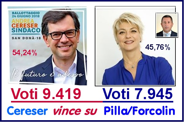 Al primo turno il distacco tra Cereser e Pilla è stato di 1387 voti, nel secondo turno di 1474 voti (+87), Cereser ha avuto un incremento di voti al Ballottaggio di 1045, contro i 958 della Pilla, e in punti percentuale il distacco è passato da 7,18% al 8,48% (+1,30%), dunque ha avuto una conferma dall’elettorato che era lui il Sindaco che volevano, nonostante la discesa in campo dei Big leghisti, e Cereser vince anche nel confronto delle due Liste civiche “nominative/personali”, la sua ha preso 1871 voti (10,29%), l’altra della Pilla 1461 voti (7,98%), e infine scorporando sul totale le preferenze delle Liste, Cereser ha avuto 918 “crocette” contro le 172 della Pilla (meno di diversi candidati consiglieri), che dire, numeri alla mano, io questa la chiamo una vittoria netta su tutta la linea.