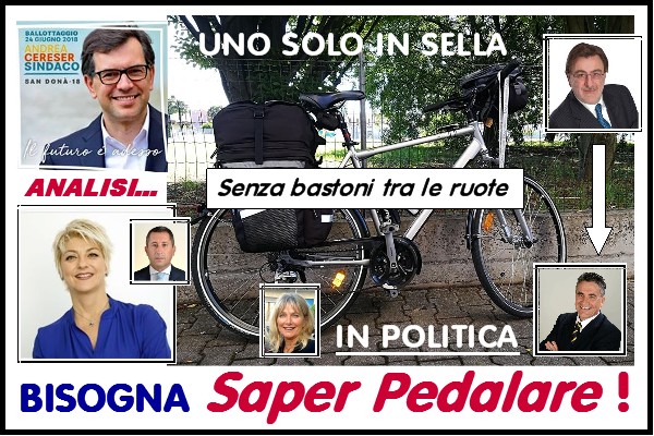 Adesso Andrea Cereser, il rieletto sindaco di San Donà di Piave, in sella alla sua bella bicicletta (clicca qui) ha preso la via dell’Appennino, giustamente si è regalato una settimana di riposo (?!) pedalando alla giusta andatura in cerca di quel relax ritemprante che gli servirà al suo ritorno, Cereser ha dimostrato anche metaforicamente di saper salire in sella e pedalare nella giusta direzione avendo una meta precisa e pensata prima, cosa questa che è mancata ai suoi rivali, che si sono messi i bastoni tra le ruote da soli, e a provare il salto al volo sulla bicicletta qualcuno ha rischiato di non trovare il sellino, con fantozziana scena delirante…