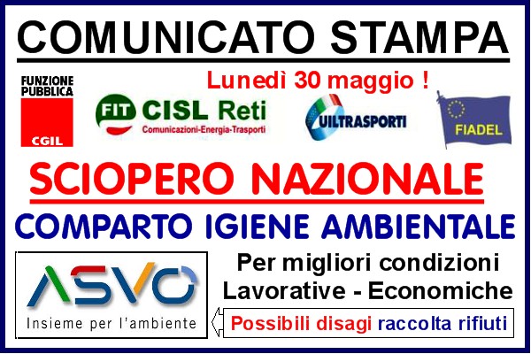 c’è uno Sciopero Nazionale nel Comparto Igiene Ambientale che da noi sta principalmente per ASVO (Azienda Servizi Venezia Orientale), e che vede unite le Sigle sindacali di FP CGIL – FIT CISL – UILTRASPORTI – FIADEL, a dimostrazione dell’unanimità di pensiero per questo Settore che ha una importante funzione sia per l’Ambiente che per il Sociale…