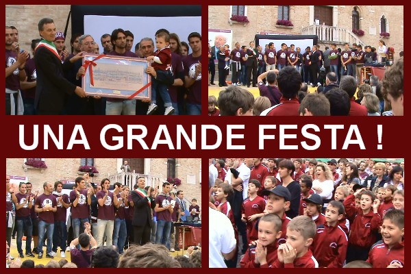 Un Sabato di Festa, di quelli che Portogruaro non dimenticherà tanto facilmente, una Piazza colma di gente, sportivi e non, che applaudiva e inneggiava ai suoi nuovi “eroi”, un tributo sincero e spontaneo, che nasce dal cuore, un segno di riconoscenza verso chi ha portato la Città alla Ribalta Nazionale, vincendo Campionato e Coppa Disciplina !