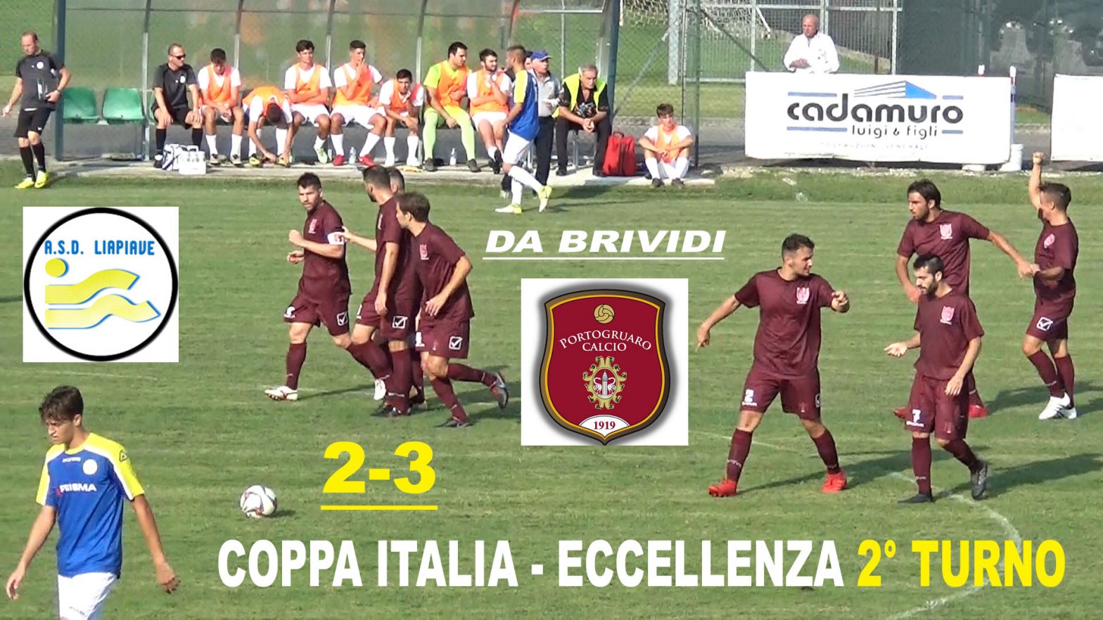 Nel video la sintesi della partita, con il Portogruaro che parte fortissimo, e va a segno al 9′ con un gran tiro dal limite di Marco De Anna, mentre 1 minuto prima era stato annullato un gol di testa a Denis Maccan, colto in fuorigioco… Per il Liapiave pareggia il difensore Dario Cofini con una prodezza balistica da metà campo, avendo visto il portiere avversario fuori dai pali… un pareggio che nei primi 45′ non cambia, con i granata vicini al raddoppio… Nella ripresa la musica cambia con i cambi, trevigiani più convinti e aggressivi, ma sono i portogruaresi ad andare nuovamente in vantaggio con Riccardo Venaruzzo scattato sul filo del fuorigioco, poi il Portogruaro ha altre occasioni per il colpo del KO, ma è poco preciso nella conclusione finale… e vien così punito dal Liapiave, che in crescendo trova il pareggio con un calcio di rigore per fallo sull’attivissimo Alessandro Furlan trasformato dall’ottimo Alessandro Beccia, si potrebbe pensare che la partita finisca qui, ma i padroni di casa insistono e provano a vincere, ci vanno vicini con un gran tiro da ottima posizione da dentro l’area, parato d’istinto dal nostro Andrea Mason, e poi si vedono negare un rigore per un presunto fallo di mano sugli sviluppi di un calcio di punizione… che però l’arbitro non vede, e così si arriva alla beffa finale, un errore della difesa di casa a centrocampo, che regala la palla agli avversari, bravi a concretizzarla con Matteo Giglio, per il 2-3 finale.
