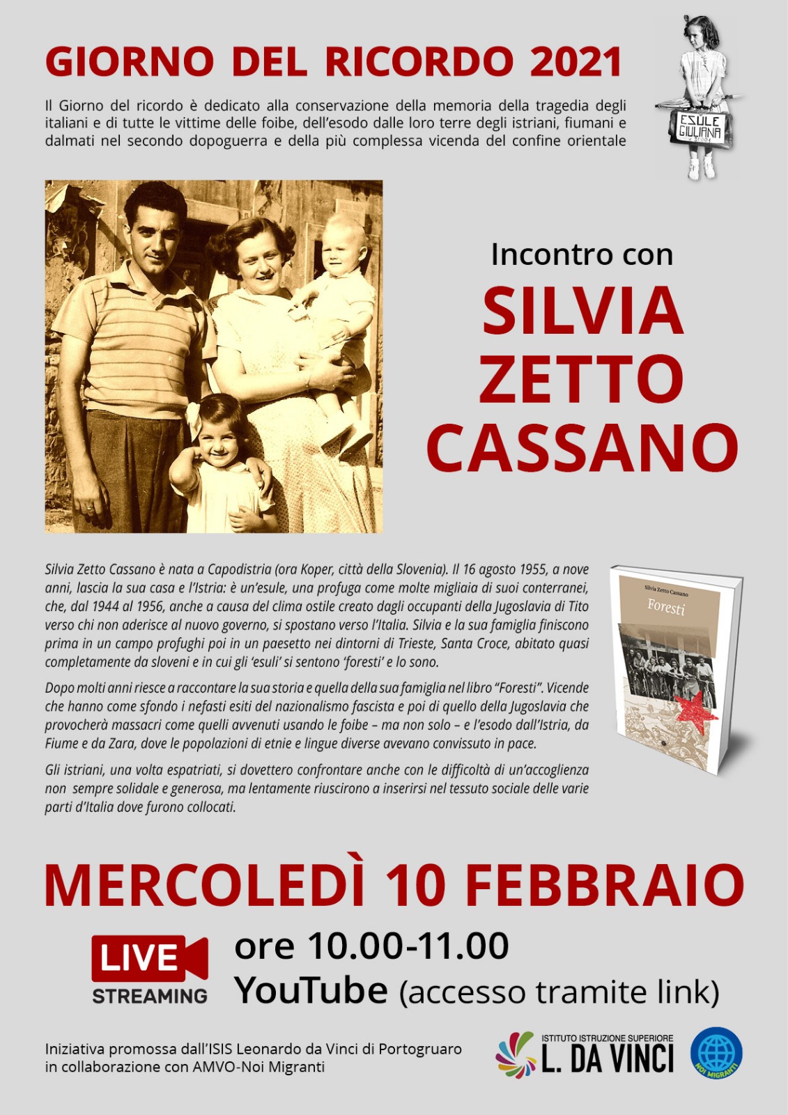 In occasione del Giorno del Ricordo 2021, mercoledì 10 febbraio p.v.,  l’ISIS Leonardo da Vinci in collaborazione con AMVO- Noi Migranti, ha organizzato un incontro streaming con la scrittrice Silvia Zetto Cassano (ore 10.00-11.00).