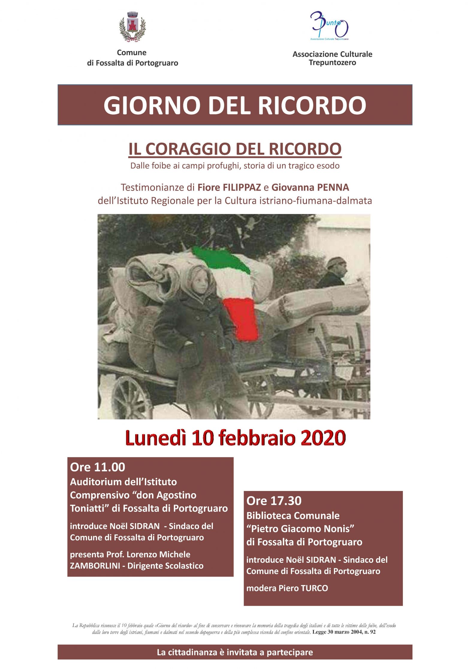 L’Amministrazione Comunale di Fossalta di Portogruaro per celebrare il Giorno del Ricordo ha organizzato, in collaborazione con istituti culturali e associazioni del territorio, due momenti di riflessione aperti alla cittadinanza, in cui Fiore Filippaz e Giovanna Penna rinnoveranno – anche con testimonianza diretta – la memoria della tragedia degli italiani nell’esodo giuliano-dalmata, delle vittime delle foibe e delle vicende storiche del confine orientale.